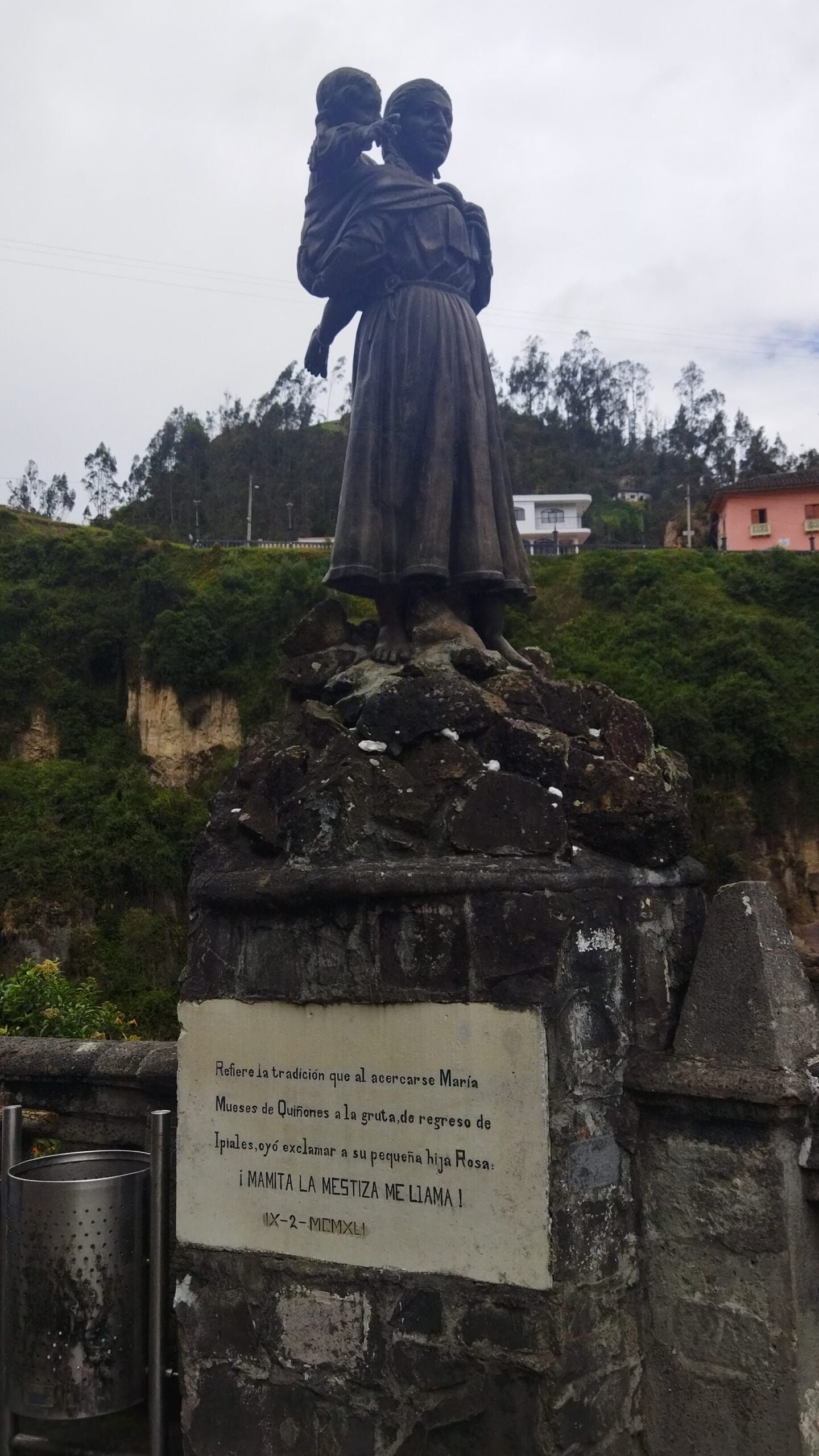 La historia comienza en 1754 cuando la indígena María Mueses de Quiñónez transitaba por el camino peatonal de Potosí a Ipiales con su hija Rosita, quien era sordomuda de nacimiento. En un momento dado, la niña sorprendentemente exclama “mamá, la mestiza me habla” señalando una cueva. Al acercarse a investigar, descubrieron en una roca de 3 metros de alto y 2 metros de ancho la imagen de la Virgen María, con Santo Domingo de Guzmán a su lado derecho y San Francisco de Asís a su lado izquierdo.